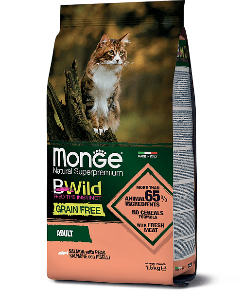 Monge BWild Cat GRAIN FREE SALMONE/PEAS — это полноценный сбалансированный рацион из лосося и гороха, который разработан с учётом физиологических особенностей взрослых кошек. Идеально подходит в качестве повседневного рациона для домашних питомцев. Высокий уровень белка в составе корма и содержание в нем L-карнитина позволяет кошке долгие годы сохранять активность и хорошую физическую форму. Содержит важнейшие антиоксиданты, такие как витамин Е.