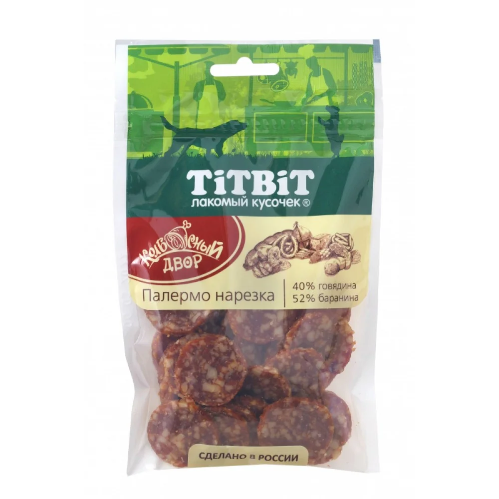 Колбасный двор для собак TitBit – это высококачественные мясные деликатесы, которые отлично подходят в качестве поощрения животного или просто побаловать своего любимца. Содержание мяса и мясных субпродуктов 92%. Не содержат соль и искусственных компонентов. Единственные мясные колбасы, представленные в виде нарезки!