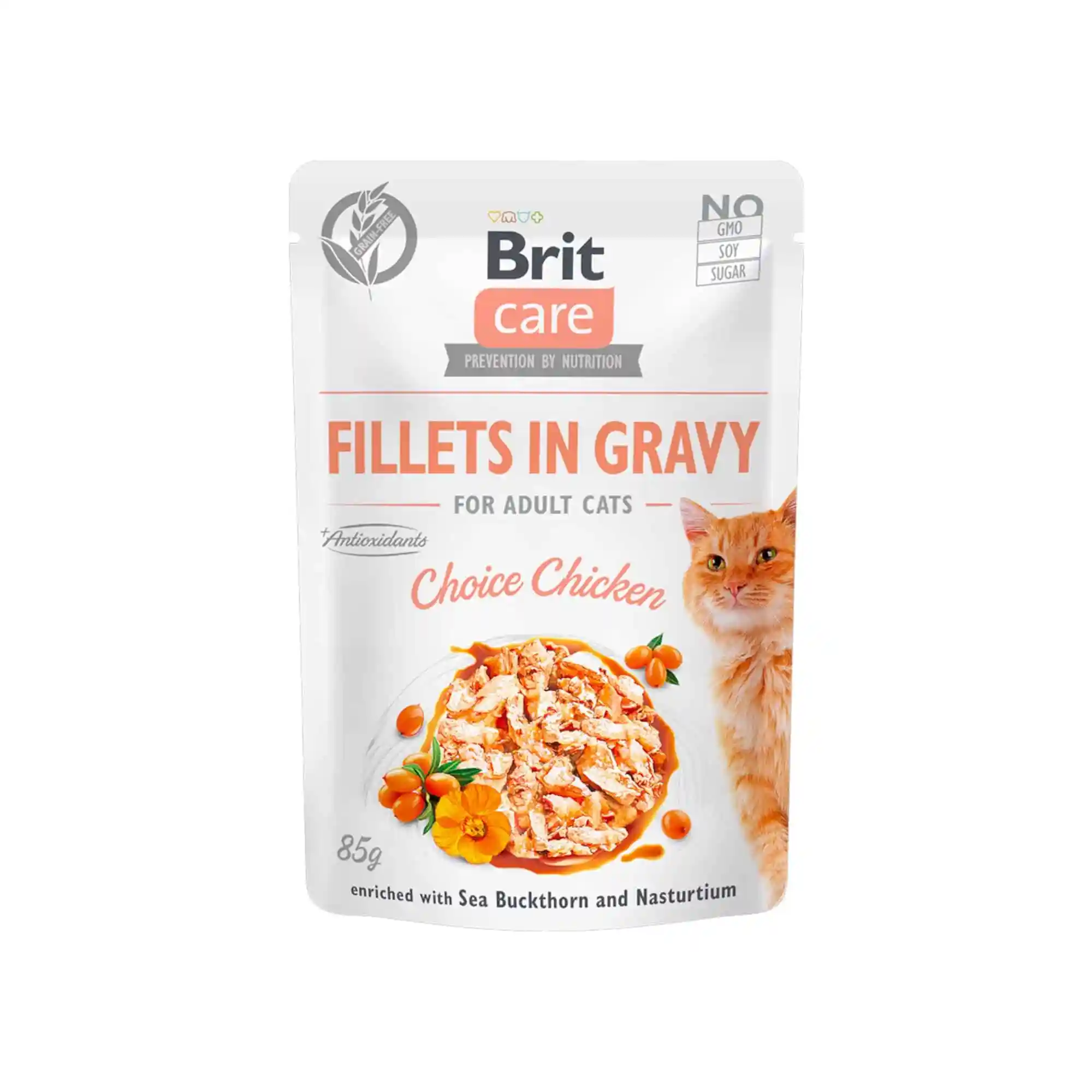 Кошачье меню должно быть разнообразным, вкусным и полезным для здоровья. Деликатесный влажный корм Brit Care может использоваться как полноценный продукт питания или как дополнение к сухому корму для повышения разнообразия и аппетита. Его оценят и очень требовательные кошки, и кошки с проблемным потреблением корма. Благодаря добавлению облепихи и настурции корм помогает предотвратить заболевания мочевыводящих путей.
