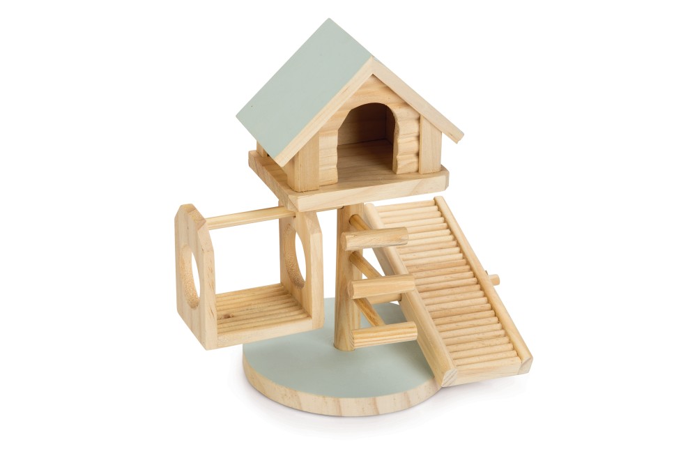 Домик состоит из четырех различных элементов: качелей, 2-х лестниц и домика, в котором ваш грызун может отдохнуть после игр или переночевать. Благодаря прочной нижней опоре вся конструкция очень устойчива.