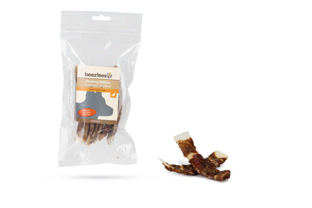 Жевательные ребрышки Beeztees из говяжьих жил белого цвета с уткой — это вкусное натуральное лакомство со слоями утиного мяса