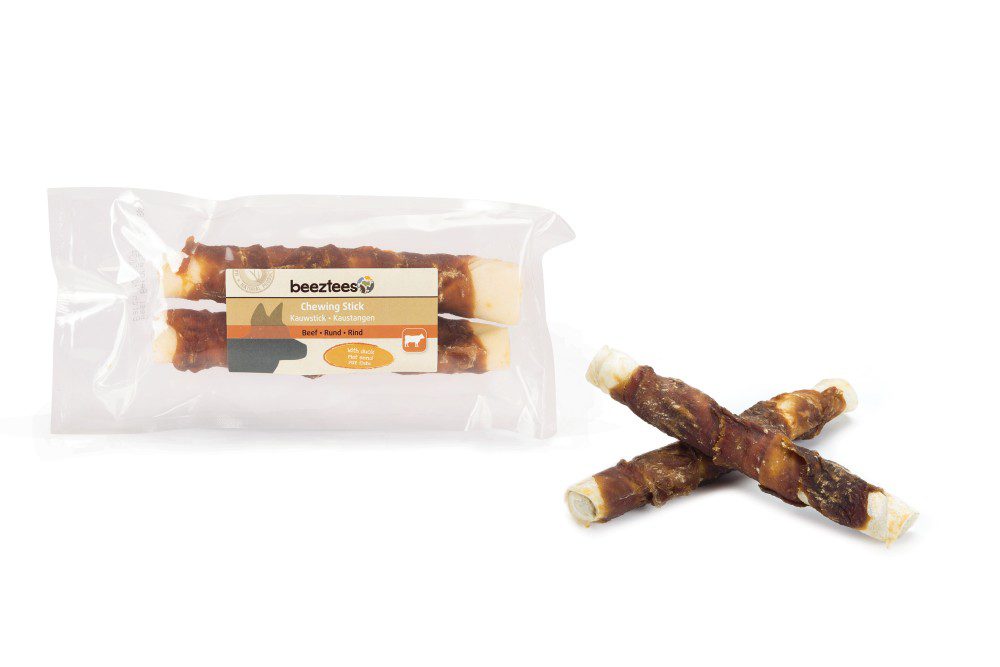 Жевательная палочка Beeztees из говяжьей кожи белого цвета с уткой — это вкусное натуральное лакомство со слоями утиного мяса.