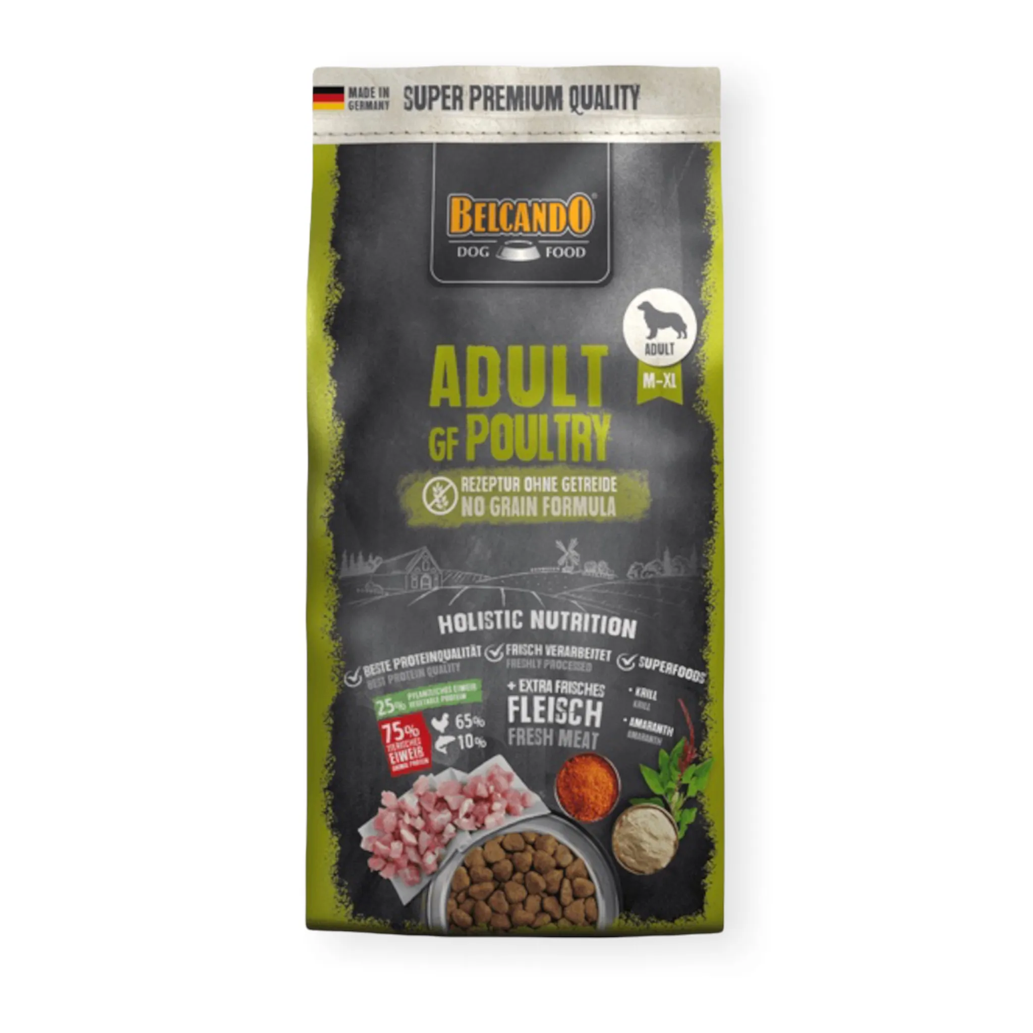 Belcando GF Poultry – для взрослых собак с нормальной активностью и чувствительностью к злакам (глютен). Питательный корм для собак, которые плохо переносят глютен и зерновые.