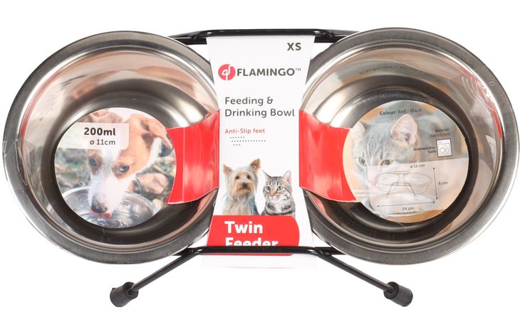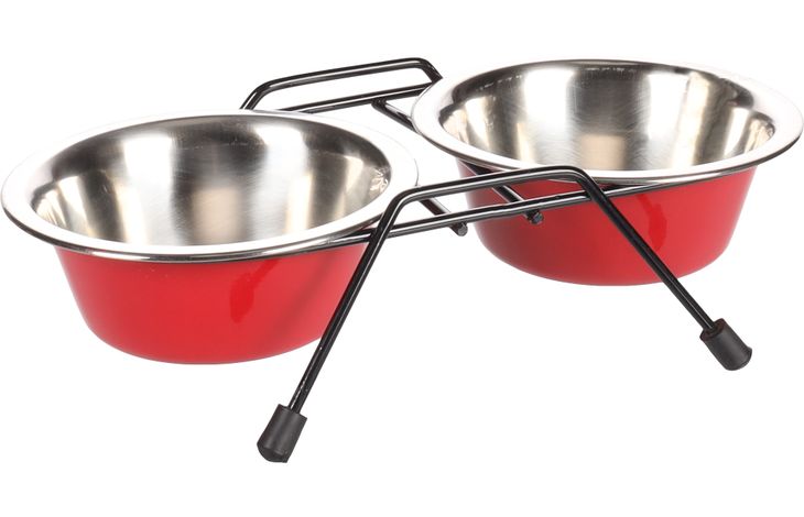 Две миски из нержавеющей стали в стальной подставке с противоскользящим покрытием.
