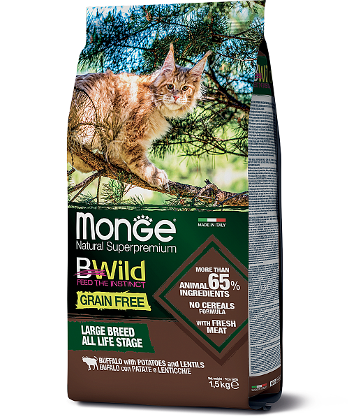 Ингредиенты: мясо буйвола дегидрированное (38%), картофель (15%), свежее мясо курицы (15%), животный жир (13%) (очищенное куриное масло 99,5%), чечевица (8%), картофельный белок, рыбий жир (очищенное лососевое масло 99,5%), гидролизованный животный белок, сухая свекольная пульпа, пивные дрожжи, минеральные вещества, маннанолигосахариды (MOS 1%), ксилоолигосахариды (XOS 0,3%), юкка Шидигера (0,1%), спирулина (0,1%) глюкозамин (0,057%), хондроитинa сульфат (0,04%).
