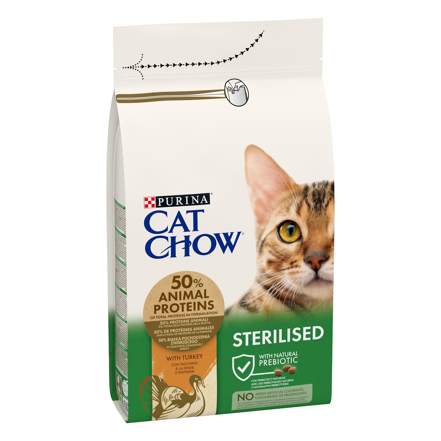 - Purina CAT CHOW для стерилизованных кошек с индейкой – это полнорационный корм, специально разработанный со сбалансированным уровнем белков и жиров, что помогает поддерживать силу мышц и оптимальный вес.