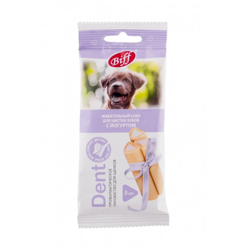 Biff «DENT» с йогуртом – это жевательный снек для щенков, необходимый для снятия мягкого зубного налёта, массажа дёсен и формирования правильного прикуса у щенков за счет специально разработанной формы и текстуры, используется в качестве лакомства и поощрения. Рекомендуется для щенков мелких и средних пород.