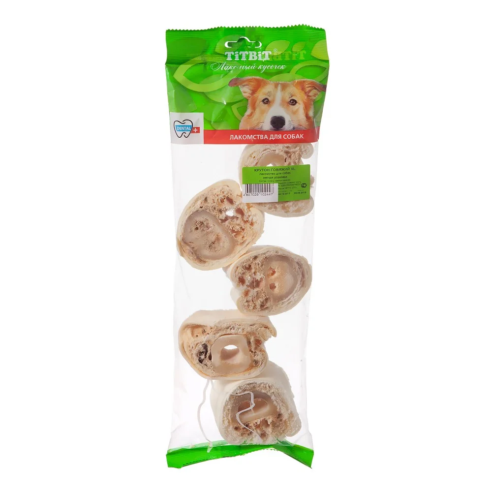 Высушенная говяжья голень, нарезанная поперек кости. Упаковка содержит 5-6 крутонов. Изделие содержит кожу, костную ткань, жир, соединительную ткань и небольшие прослойки мышечной ткани. Обеспечивают дополнительное поступление в организм глюкозамина и хондроитина — составных элементов для роста, развития и поддержания в норме суставов собак. Массирует десны и укрепляет жевательную мускулатуру, очищает зубной налет и предотвращает возникновение зубного камня. Прекрасная игрушка, сохраняющая в целости предметы интерьера и личные вещи. Изделие содержит трубчатую кость и не предназначено для полного поедания. Как только собака съела футляр из кожи, сухожилий и мышц – необходимо заменить лакомство на новое.