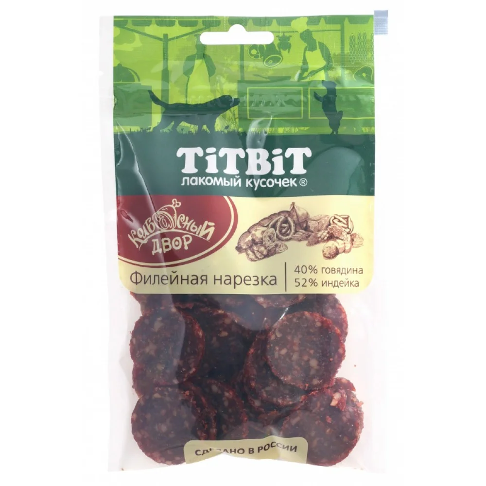 Колбасный двор для собак TitBit – это высококачественные мясные деликатесы, которые отлично подходят в качестве поощрения животного или просто побаловать своего любимца. Содержание мяса и мясных субпродуктов 92%. Не содержат соль и искусственных компонентов. Единственные мясные колбасы, представленные в виде нарезки!