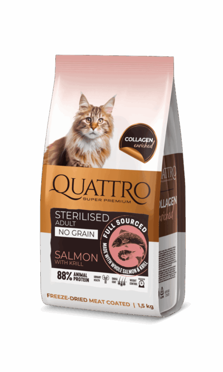 QUATTRO for adult sensitive cats with salmon and krill, сухой корм для взрослых кошек с чувствительным пищеварением, с лососем, крилем и коллагеном.